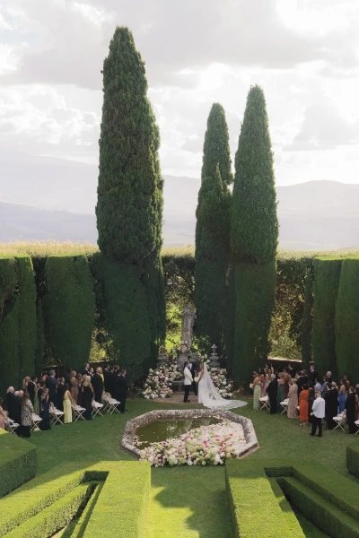 Hidden behind an iron gate, the villa reveals itself in all its grandeur: an enchanting balance of scale and harmony. Its Italian gardens, with sculpted hedges, fountains, and cypress-lined paths, provide a spectacular backdrop for welcoming guests with a pre-ceremony cocktail surrounded by nature.