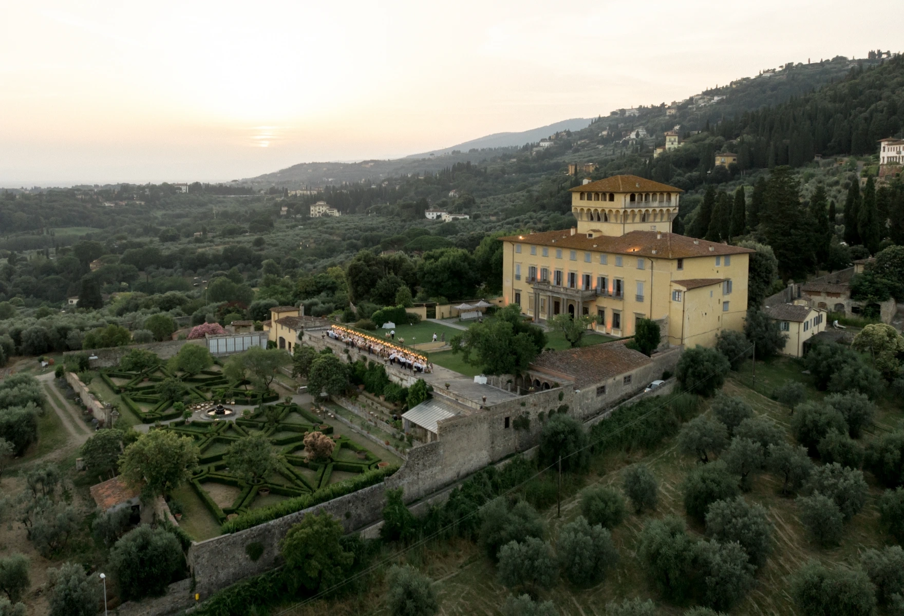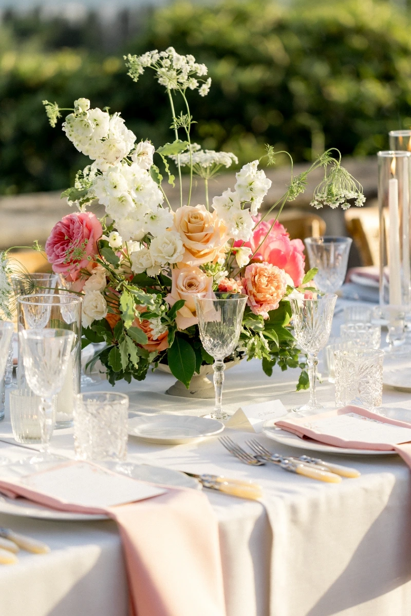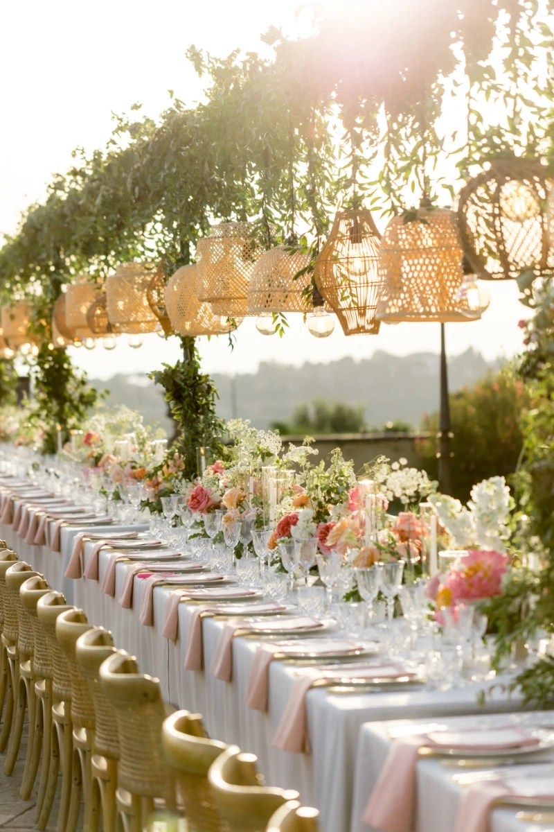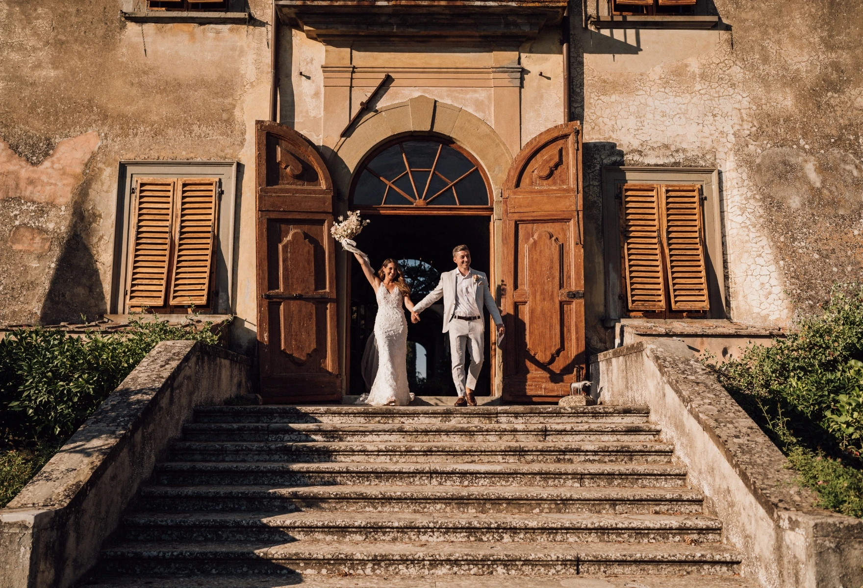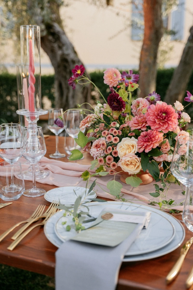 Instead for the wedding day they chose a villa in the hills. A vibrant floral palette reflected their spirit: informal elegance, full of joy. Guests enjoyed a tasteful dinner on the terrace, then a wild party in the villa’s grand hall, and… as true party animals, they topped it all off with an after party at Piazzale Michelangelo.